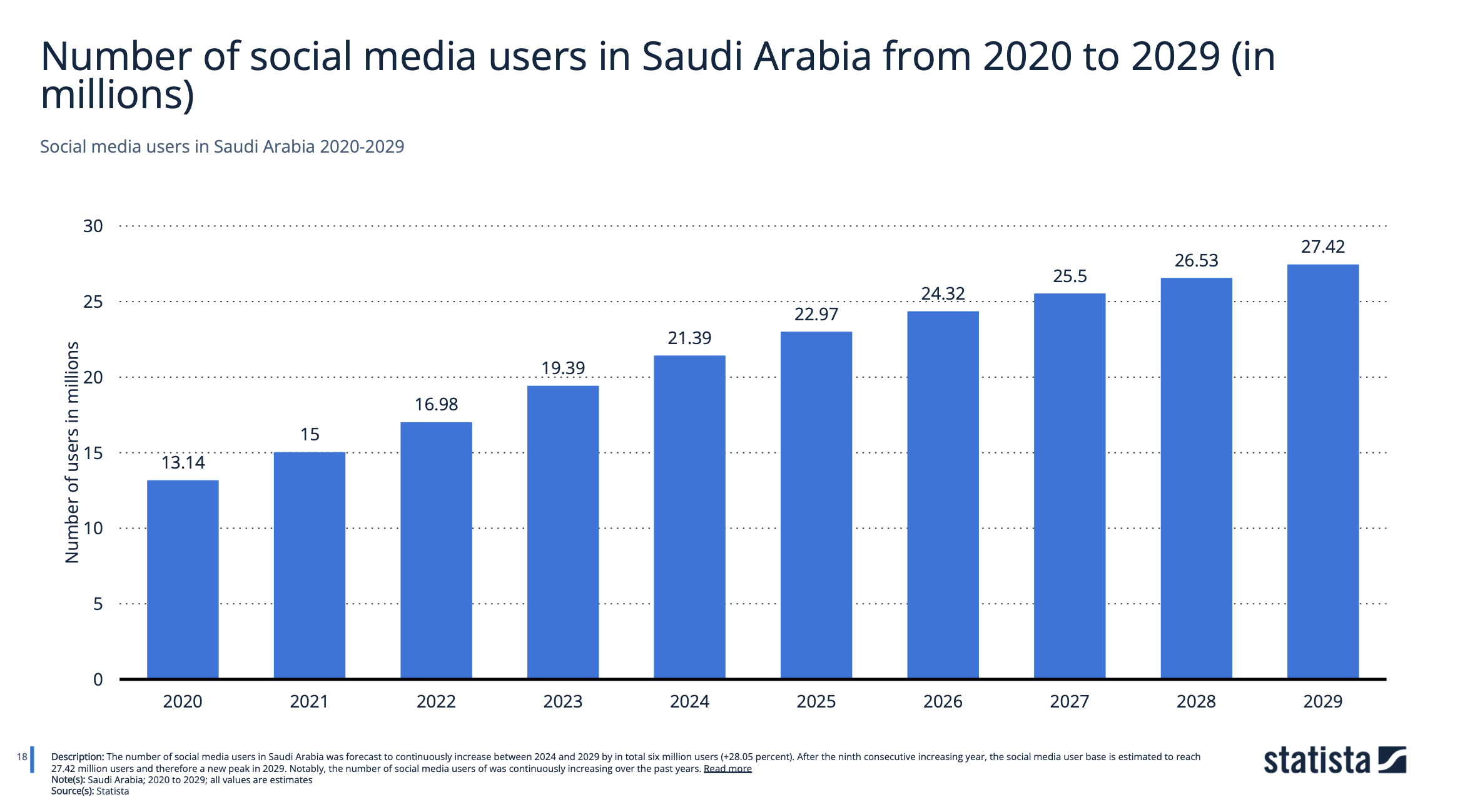 Saudi Arabia’s social media user base is on a steady rise, expected to reach 27.42 million by 2029. This increase reflects a broader digital adoption, with mobile internet access projected to reach 74.52% of the population by the same year. Social media is no longer just a tool for connection; it’s a cultural and economic force shaping modern Saudi society.