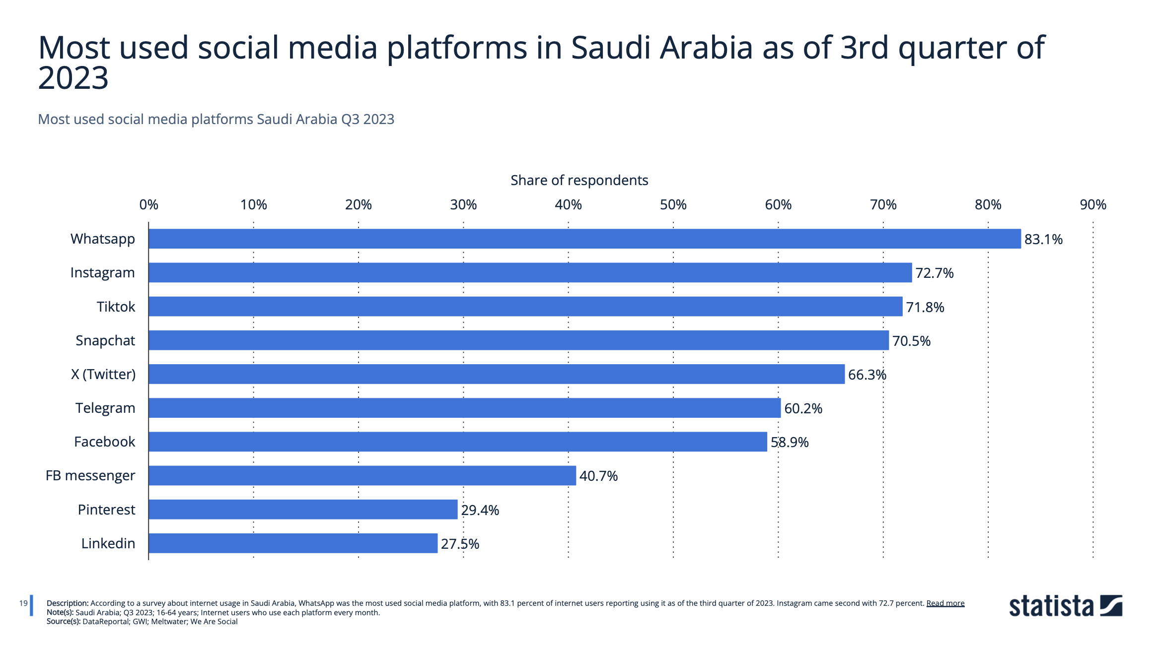 - WhatsApp dominates as the most-used platform, engaging 83.1% of internet users in Q3 2023. Its simplicity and accessibility make it a staple for personal and business communication.